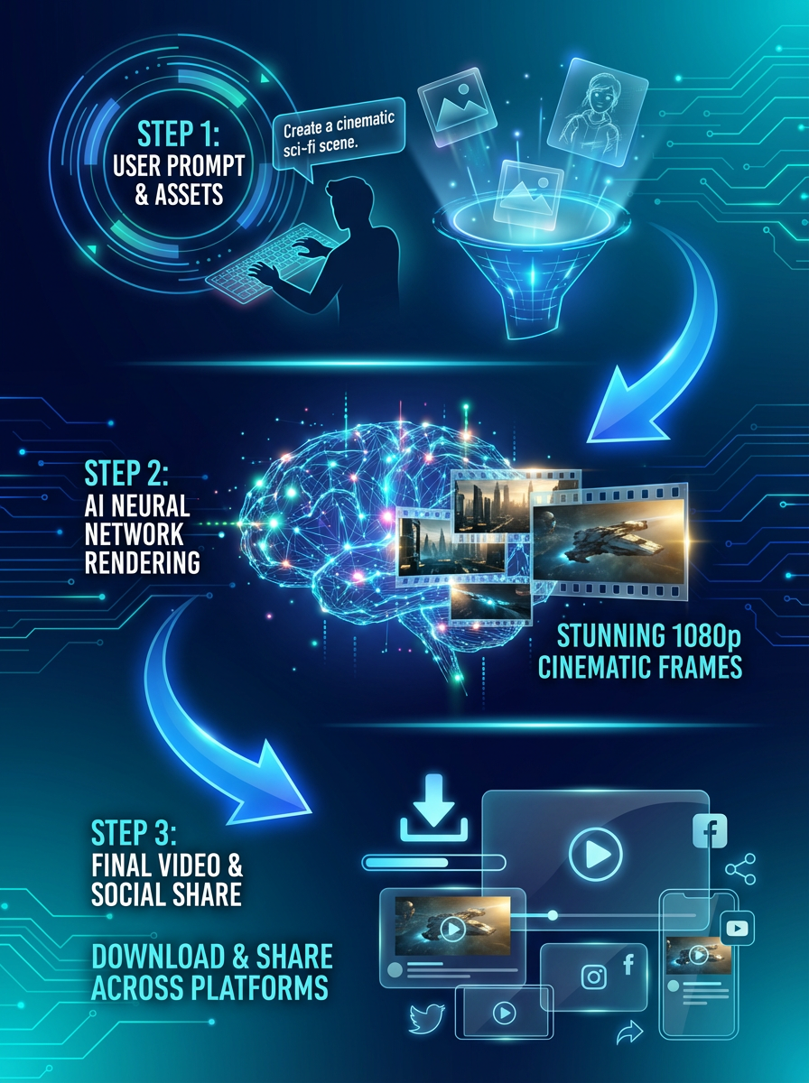 Transform your ideas into production-ready cinematic content with an intuitive workflow: